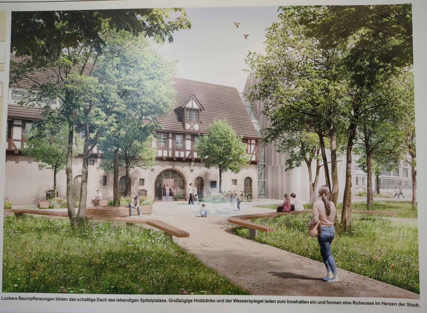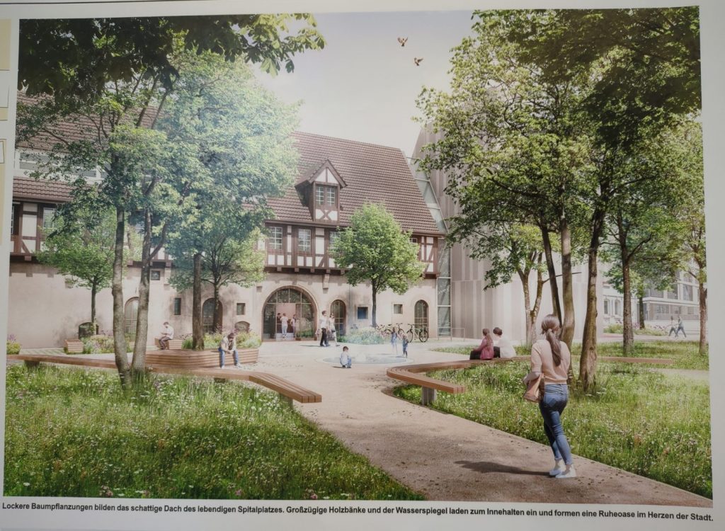 Als eine Art Ableger vom Schlosspark hat der Entwurf der Freiburger Landschaftsarchitekten von „factorgruen“ den Wettbewerb zur Gestaltung des Archivplatzes gewonnen: Wiesenfläche, Bänke und ein Wasserspiel. Genau wie dort. Der Beton-Anbau der neuen Leihbücherei ist von großen Bäumen verdeckt.