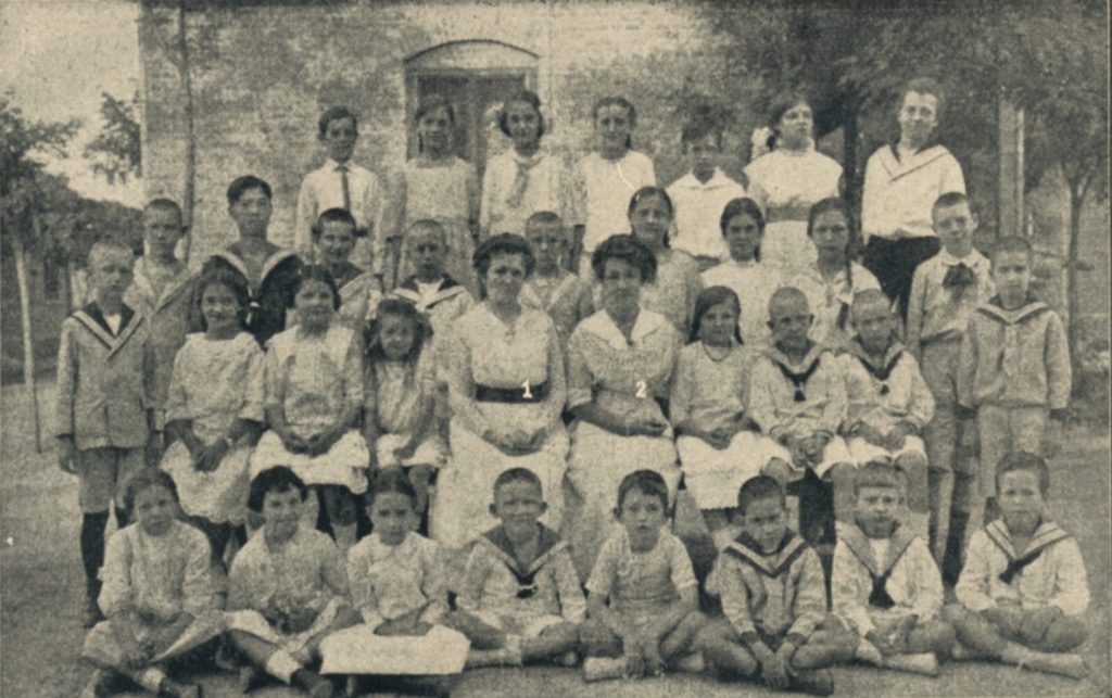 Auf einem Foto aus dem Jahr 1918 sind neben der Schulleiterin Lina Holland (1) eine weitere Lehrerin, Emma Arbs (2), sowie 32 Schülerinnen und Schüler zu sehen.